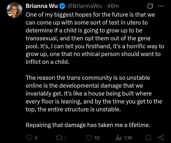 Brianna Wu is a trans woman who is very much a transmedicalist gatekeeper and a “fuck you I’ve got mine” sort. She is not an ally, any more than Caitlin “wah my passport now says I’m male but I still love Trump” Jenner is an ally. And now Wu has descended into advocating genocide by eugenics: