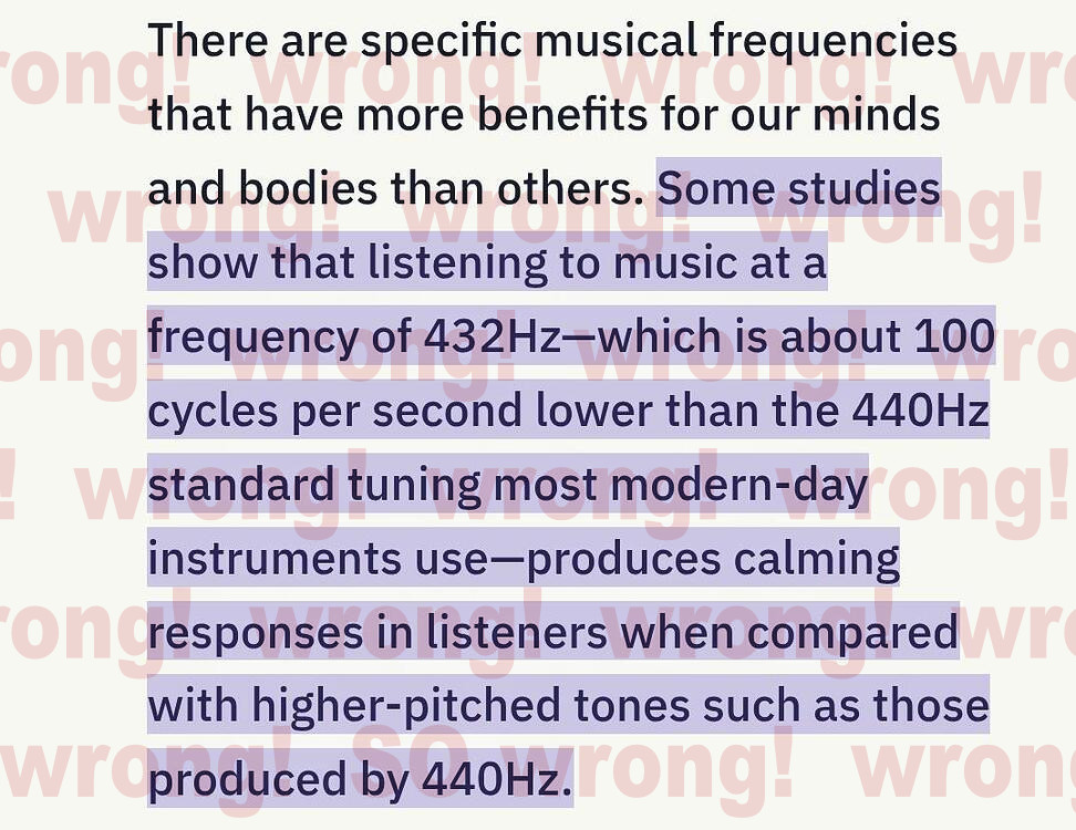 2. The whole 432Hz tuning thing was based on a really flawed, small study that claimed that participants who listened to music where the instruments tuned to an A432 reference pitch, instead of the international standard of A440, had lower heart rates afterward. This hasn’t been replicated by larger, more rigorous studies.